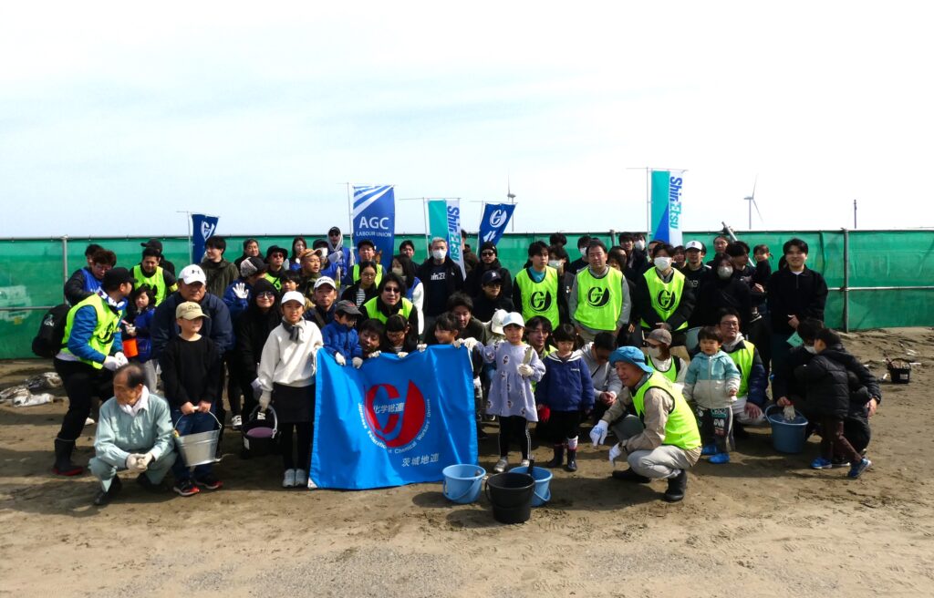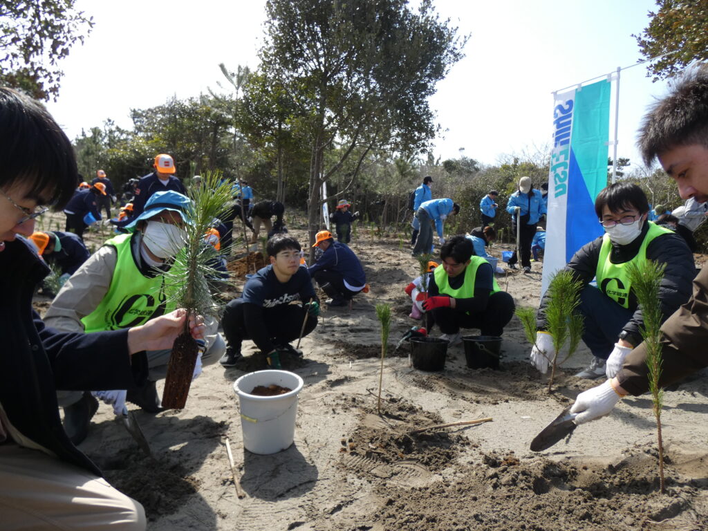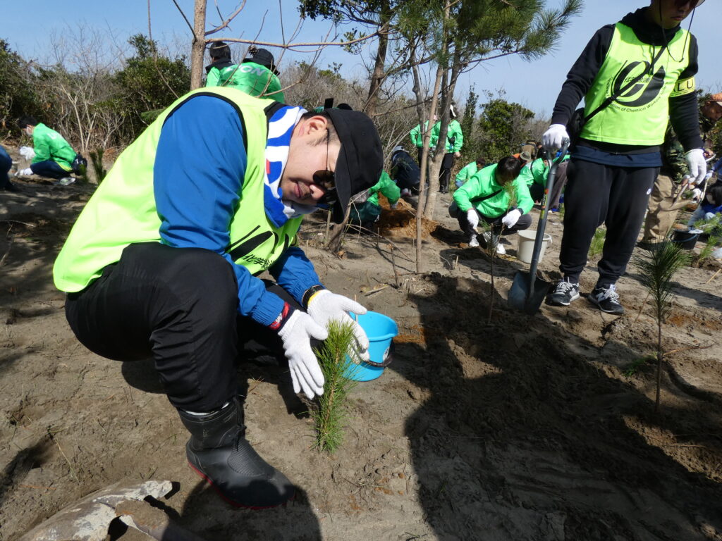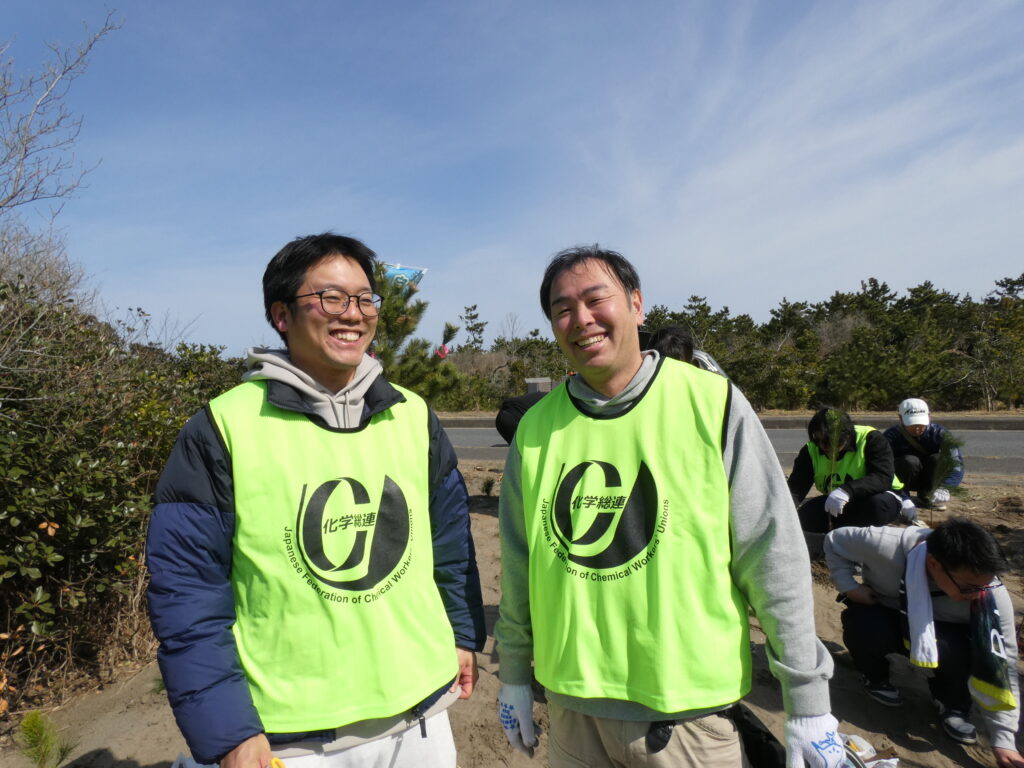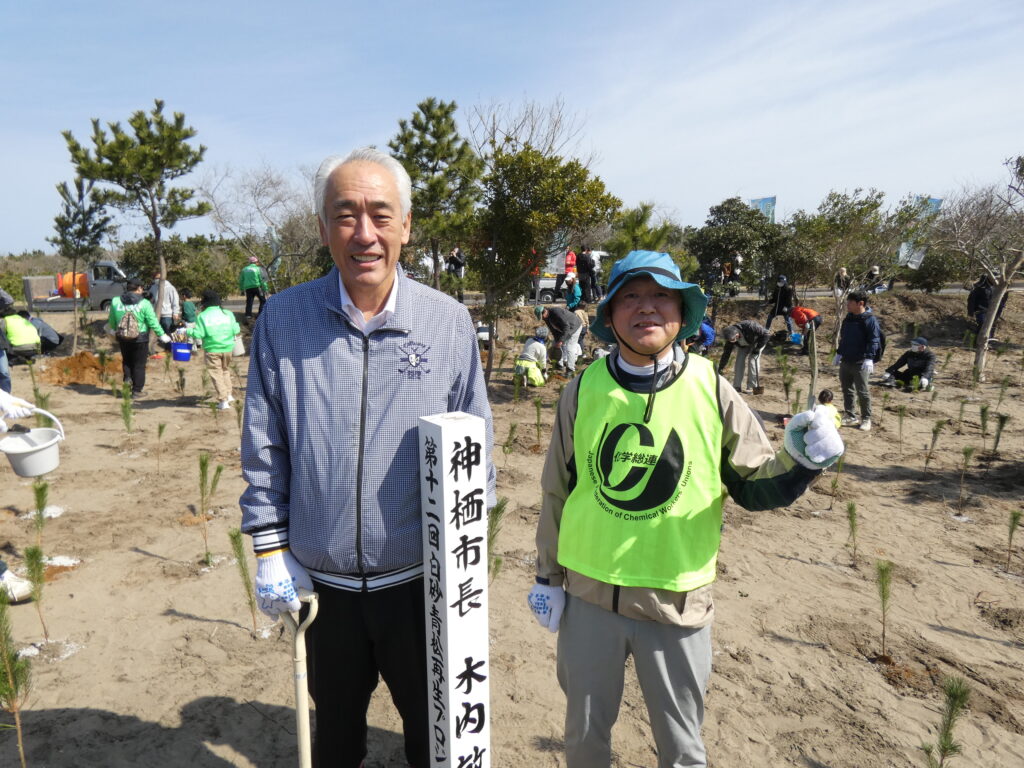 今年で第12回目となるプロジェクトで、市からの報告では約700名の方が参加されたということでした。化学総連茨城地連からも総勢79名の方にご参加いただき、先人たちが植え続けてきた松林を取り戻すべく松の苗木を植樹することで、持続的可能なまちづくりに貢献できたと思います。年々参加者が増えているとのことで、当日は用意された苗木3000本があっという間に植樹されていきました。終了後は市が用意してくれたとん汁で身も心も温まり、穏やかな気持ちで会場を後にしました。